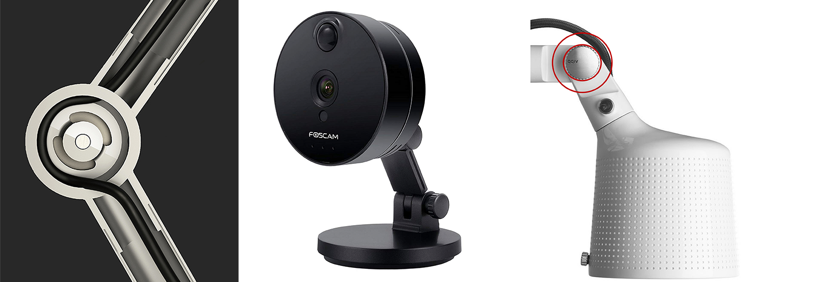 ⑥ 萬向型 通過一種滾珠結(jié)構(gòu)轉(zhuǎn)動來實(shí)現(xiàn)各方位角度的調(diào)節(jié),多應(yīng)用于輕小型產(chǎn)品中,這種滾珠結(jié)構(gòu)一般都會打孔,一來是能夠防止塑料縮水,二來可以方便從中間走線。